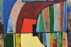 The work is built on the language of pure geometric forms and open color — arches, rectangles, vertical stripes organize the canvas space like an architectural drawing, interpreted through the prism of painting.