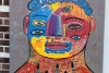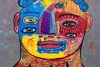 Центральный образ — крупное, антропоморфное, но сильно искажённое лицо, занимающее большую часть холста. Оно разделено на несколько ярких цветовых блоков: синий, жёлтый, красный и фиолетовый, что создаёт эффект мозаики или внутренне раздробленного мира.
