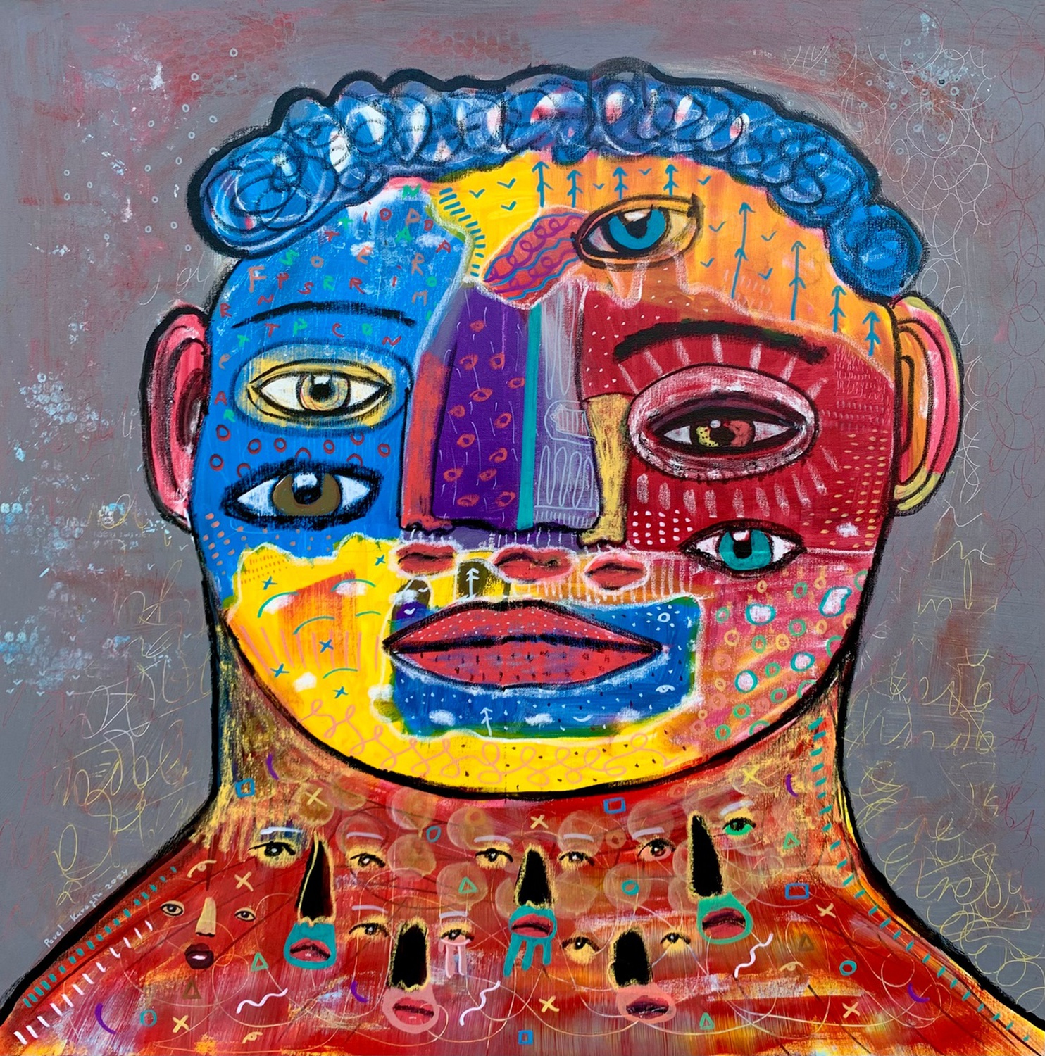 Лицо и шея персонажа буквально усыпаны множеством глаз и губ, выполненных в разных размерах и стилях. Эти глаза смотрят в разные стороны, символизируя множественность взглядов, мыслей и внутренних конфликтов. Губы, часто выделенные красным или синим, кажутся одновременно говорящими и безмолвными.