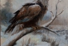 A painting depicting an eagle sitting on a branch. The eagle has brown and gray feathers, its wings slightly spread. The branch on which the eagle sits appears sturdy and curved. In the background, blurred outlines of trees and shrubs are visible, creating the impression of a winter landscape. The color scheme of the painting is predominantly cool, with shades of gray, blue, and white, giving the image a winter atmosphere.