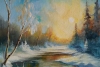 На картине изображён зимний пейзаж на закате. В центре картины протекает река, покрытая тонким слоем льда. По обеим сторонам реки лежит снег, который отражает тёплые оттенки заката. Слева на переднем плане стоит дерево с тонкими ветвями, частично покрытыми снегом. Справа видны силуэты хвойных деревьев, которые создают контраст с мягкими линиями снега. Небо окрашено в голубые и жёлтые тона, солнце садится за горизонт, отбрасывая тёплый свет на всю картину. Картина создаёт ощущение спокойствия и умиротворения, передавая красоту зимнего вечера.