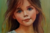 На изображении представлена девочка с длинными каштановыми волосами, которые слегка волнистые и падают на плечи. У неё большие голубые глаза, которые смотрят прямо на зрителя. Девочка улыбается, её лицо выражает спокойствие и радость. Она одета в светло-голубое платье с розовой пуговицей на груди. Фон изображения выполнен в мягких зелёных тонах, что создаёт ощущение природы и спокойствия. Картина написана в тёплых и нежных оттенках, что придаёт ей особую атмосферу уюта и тепла.