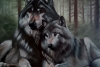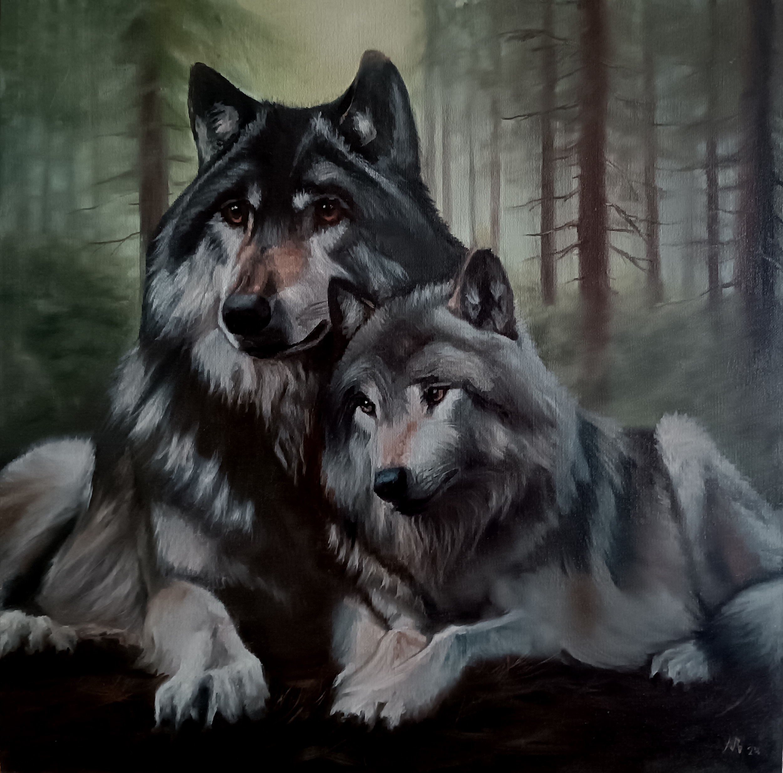 Картина 2024 года. На картине изображены два волка, сидящие рядом в лесу. Один волк больше, другой меньше. Фон размытый, зелёный и коричневый.