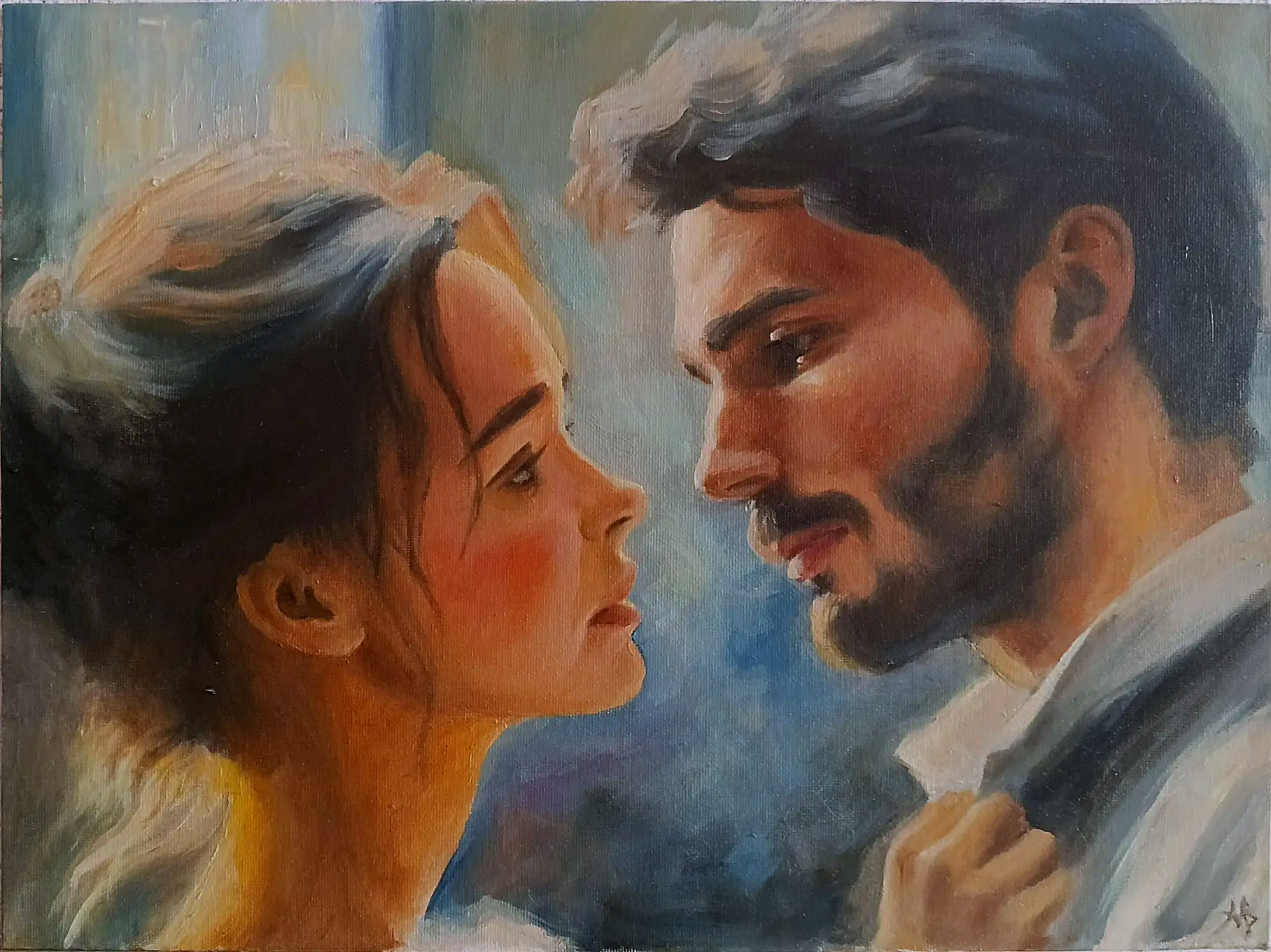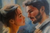 Свет, мягко скользящий по лицам героев, акцентирует внимание на их глазах — зеркале души. Доверчивый женский профиль и внимательный, теплый взгляд мужчины создают атмосферу абсолютного взаимопонимания. Цветовая гамма, построенная на контрасте теплых тонов лиц и глубокого синего фона, подчеркивает интимность происходящего. Это не просто портрет, а попытка запечатлеть саму суть эмоциональной связи. Картина приглашает зрителя разделить этот сокровенный момент, напоминая о том, как важно уметь по-настоящему «видеть» другого человека в бесконечном потоке жизни.