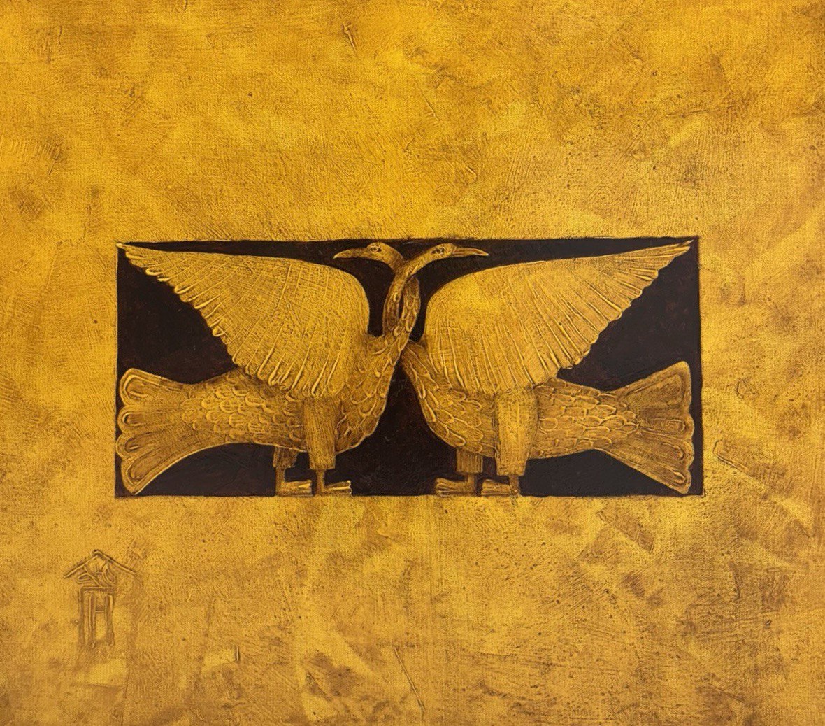 На этой картине изображены две стилизованные птицы, словно вырезанные из золота, стоящие рядом в черном прямоугольнике на золотом фоне. Их крылья расправлены, а головы наклонены друг к другу, создавая образ идеальной гармонии и единства. Орнаментальная декоративность линий отсылает к античности или древнерусскому искусству. Цветовая палитра — золото с глубоким черным — создает ощущение роскоши, вечности и священности. Картина символизирует союз, верность, возможно — супружеское счастье или уникальную близость душ.