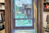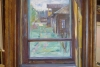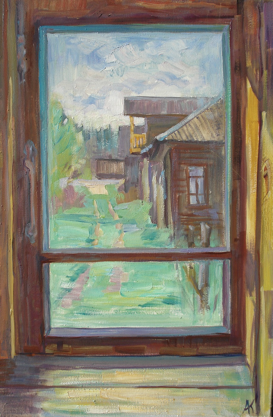 Through the glass, there is a view of the yard, painted in bright summer tones. Lush, fresh greenery predominates, painted with free, confident strokes. On the right, there is another wooden structure — possibly part of a neighboring house or a barn — with a dark roof and a small window.