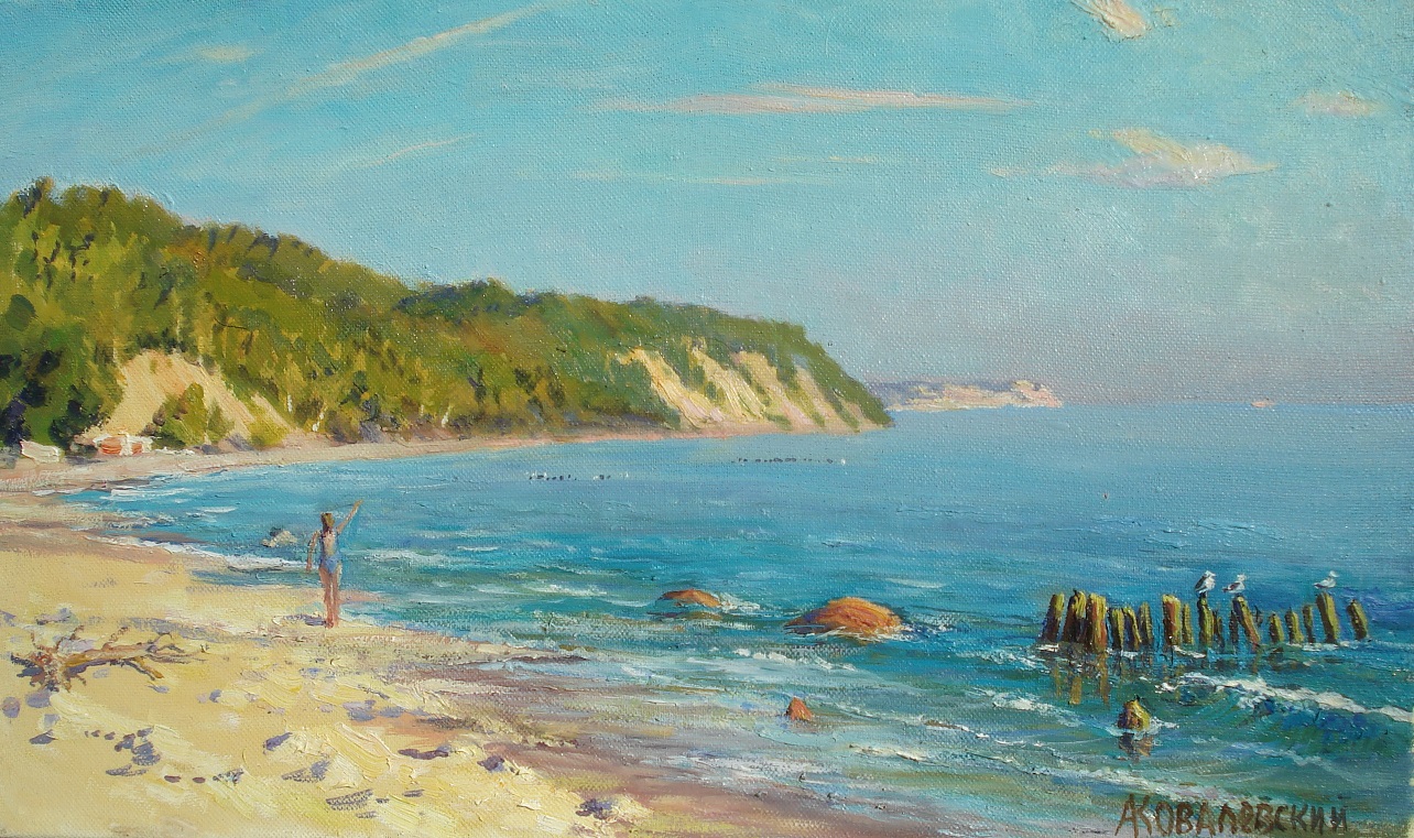 «Baltic coast» is a painting full of light and fresh air. Andrey Kovalevsky demonstrates his skill in conveying the marine landscape, where the bright sun emphasizes the texture of the water and the power of the coastal landscapes.