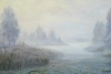Утренний туман превращает мир в сказку. Синеватая полупрозрачная дымка что-то проявляет, а некоторые части скрывает. Пейзаж озера прозрачен в утреннем тумане, особенно привлекло сияние неба от восходящего солнца сквозь дымку.