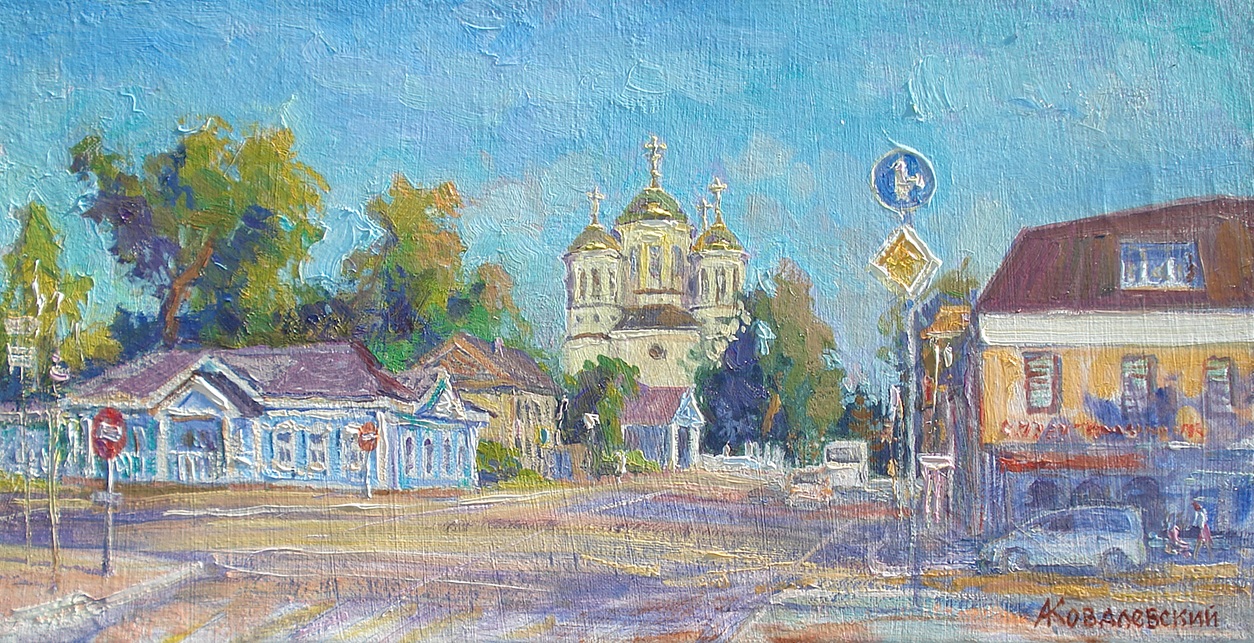 Раннее утро. Тишина. Город радостный и сияет в сиреневом свете теней, розовато-жёлтом от солнечных лучей.