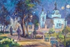 Captured the image of the evening, surreal fairy-tale Zvenigorod, all the colors are different, the mood is some kind of festivity. The Church of Alexander Nevsky majestically rises in emerald-blue reflections, the trees are lilac-purple-emerald, the shadows are lilac, the spots of light range from reddish to pink. A fairy-tale view.