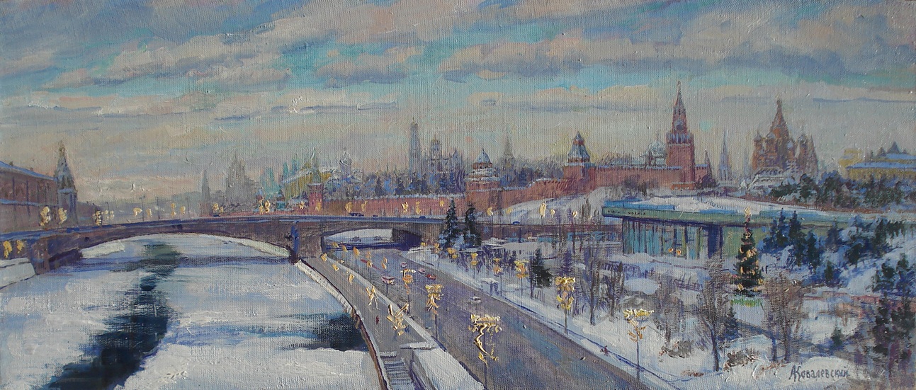 Зимний вид на Кремль завораживает. Нашёл интересный ракурс с площадки Зарядья над рекой. Кремль в зимнем сиянии, за ним почти чистое морозное небо. Жизнь бурлит, а Кремль возвышается над всем своими башнями и куполами. Акцентом выступает праздничная иллюминация города.