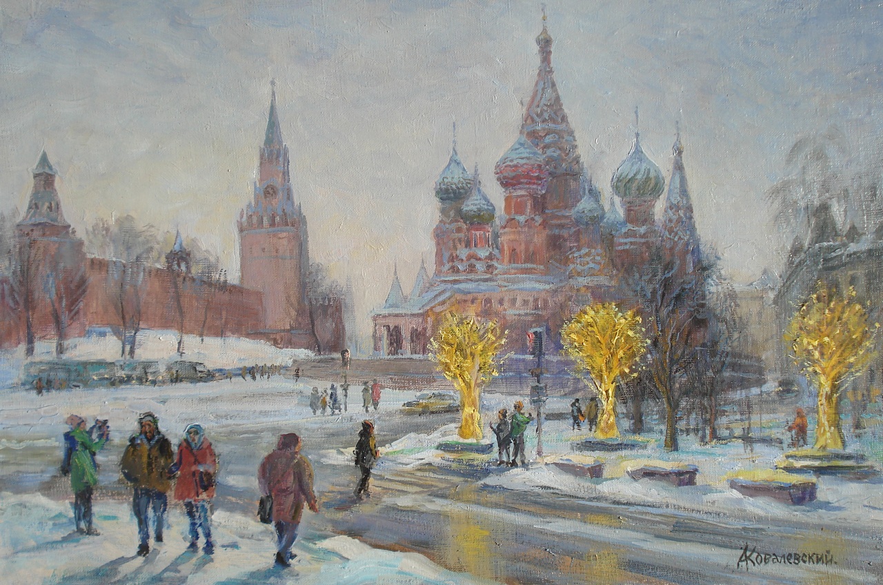 Fairy-tale winter view of St. Basil's Cathedral and the Kremlin. The lighting is wonderful, especially its contrast with the abundant snowdrifts. I tried to convey the gentle winter light of the faintly breaking sun, its reflections on the snow-covered cathedral. A harmonious pearly palette of our winter.