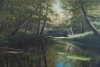 At the center of the composition is a stream, in the dark, almost mirror-like surface of which the tall tree trunks and patches of bright sky are perfectly reflected. This reflection is a key element that enhances the sense of depth and mystery of the forest ravine. The tree trunks, reaching upwards at different angles, give the scene dynamism, while the lush tall grass along the banks hints at the abundance of life in this secluded place.