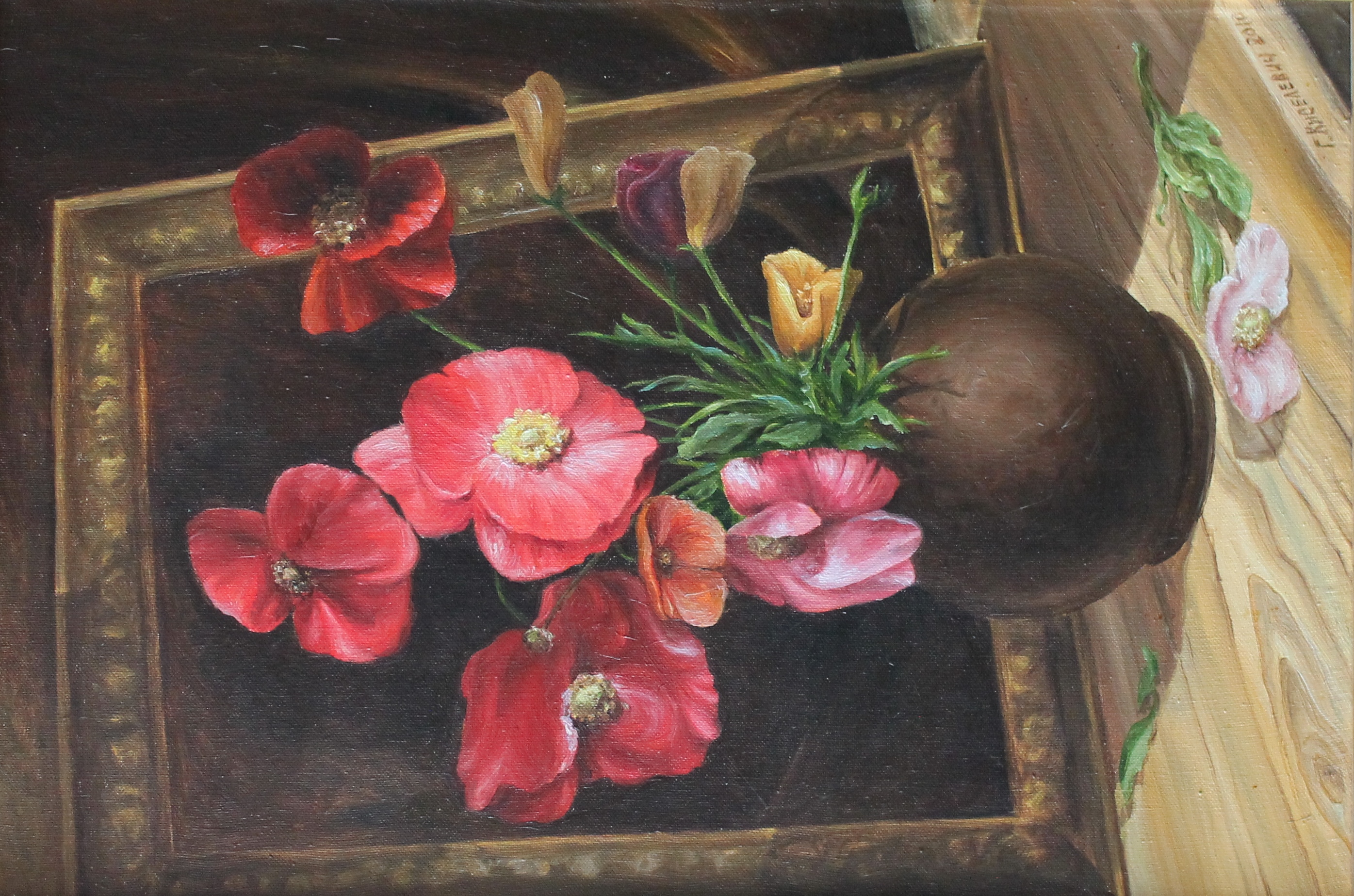 Красивый яркий букет цветов с воздушными лепестками на фоне рамы как будто создан для того, чтобы стать частью картины. Букет маков может быть подарен, чтобы выразить любовь, страсть и благодарность.