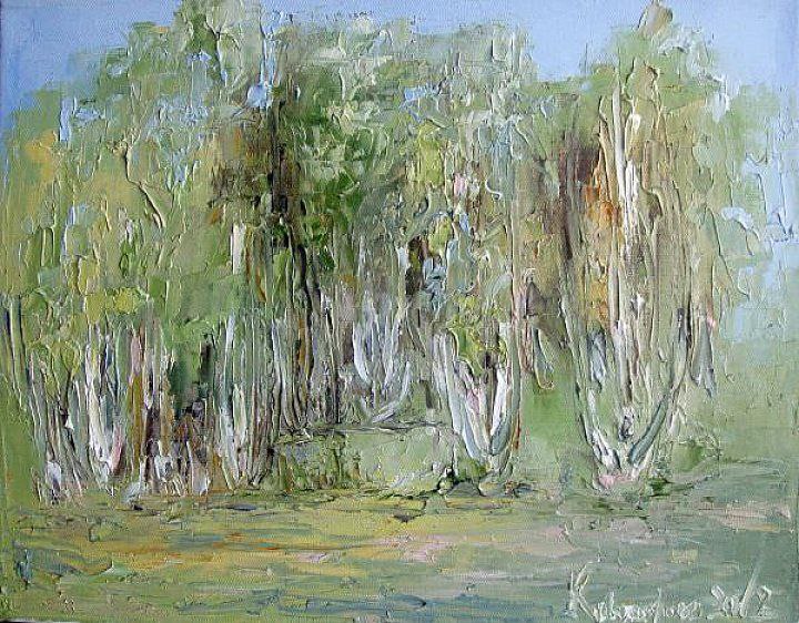 Этюд «Роща» Екатерины Кудряшовой — яркий образец импрессионистского взгляда на природу. Художница мастерски работает с густыми рельефными мазками, которые буквально лепят форму деревьев, создавая ощущение трепещущей на ветру листвы. Палитра наполнена свежими весенними оттенками зелёного, нежно-серого и охры, что придаёт полотну лёгкость и внутреннюю вибрацию света.