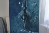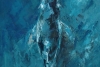 Картина «Вместе» Екатерины Кудряшовой — глубокая, медитативная работа, наполненная тишиной океанских глубин. Художница мастерски использует оттенки синего и бирюзового, создавая эффект толщины воды, сквозь которую едва пробивается свет. Силуэт кита, написанный мощными широкими мазками, кажется величественным и спокойным, а маленькая белая точка рядом — чайка — подчеркивает невероятный масштаб и безмятежность морского гиганта.