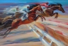 На холсте изображён захватывающий момент конного соревнования: три всадника на мощных лошадях синхронно преодолевают высокое препятствие. Центральная часть композиции отведена гнедой лошади, чья мускулистая фигура выделена яркими штрихами тёплых коричневых и красных оттенков. Всадник в синей одежде и белом шлеме сосредоточен и движется гармонично вместе с животным. Справа и слева различимы ещё две пары всадник-лошадь, выполненные более размыто и динамично, что усиливает ощущение движения и скорости. Фон заполнен диагонально расходящимися штрихами ярких и холодных тонов, создавая эффект стремительного полёта. Белое препятствие внизу уходит в перспективу, словно растворяясь в вихре красок, подчёркивая драматизм и энергию сцены.