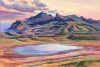 Картина Анастасии Калюжной «Долина Баракол» — захватывающий пейзаж, наполненный драматизмом и экспрессией заката над горным массивом. Художница использует смелую, почти фовистскую палитру, чтобы передать драматизм крымских гор. Горы на заднем плане написаны в глубоких синих, фиолетовых и терракотовых тонах, что придаёт им монументальность и таинственность.