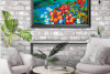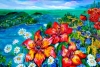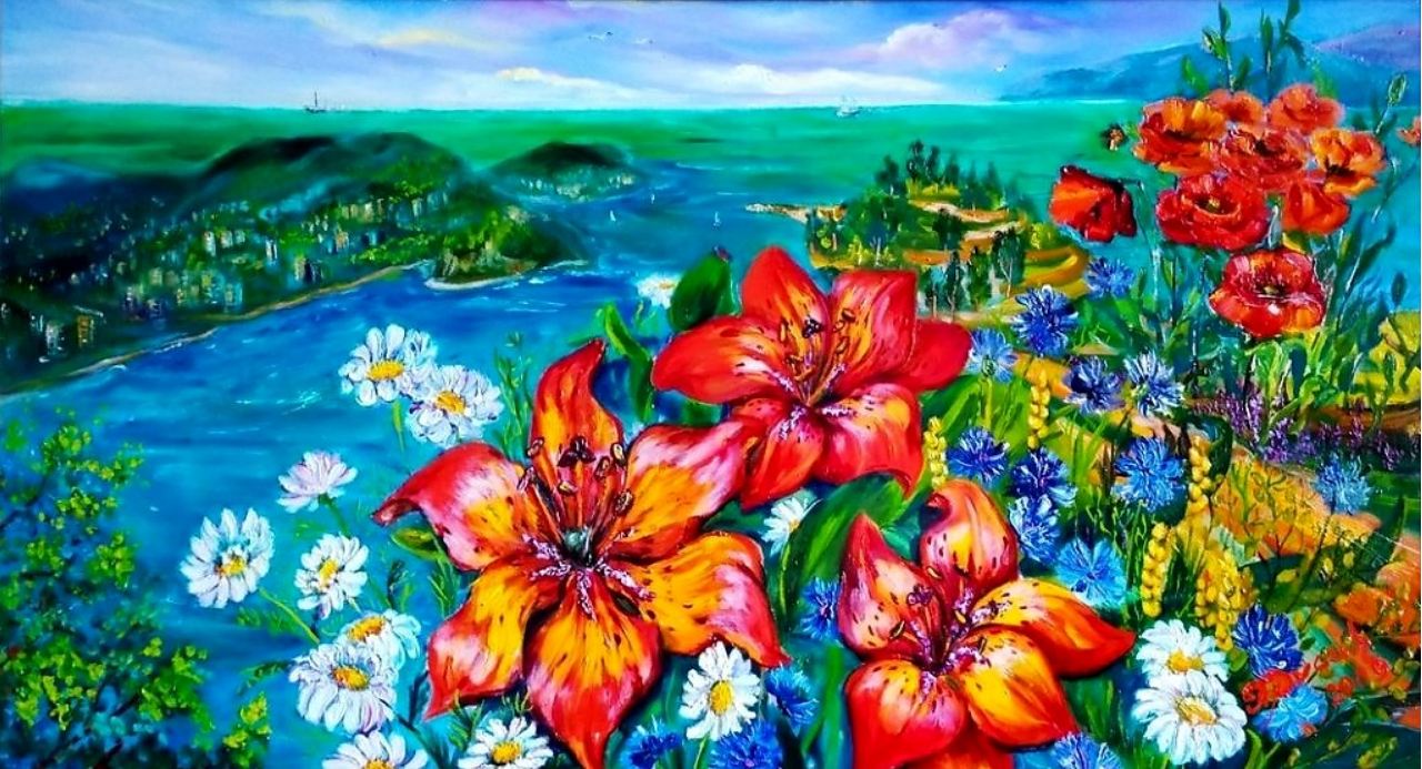 The canvas unfolds a dialogue between tenderness and power, between the fragility of a flower and the eternity of the sea. In the foreground, sunlit, scarlet lilies stand frozen in solemn repose. Their velvety petals, dotted with the finest veins, seem to drink in the light.