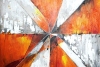 Композиция картины создаёт ощущение динамики и движения благодаря пересекающимся геометрическим формам и контрастным цветам. Основной фон, выполненный в тёплых оранжево-желтых тонах, может символизировать энергию, страсть и жизненную силу, ассоциируясь с огнём или закатным солнцем. Белые и серые диагональные полосы, пересекающиеся в центре, возможно, отражают идею баланса или конфликта, где свет и тень сливаются в гармоничном единстве. Текстура с мазками и брызгами добавляет ощущение спонтанности и эмоциональной насыщенности, что может символизировать хаос творческого процесса или неконтролируемую природу чувств. В целом, работа передает глубокий эмоциональный посыл, приглашая зрителя к личной интерпретации символов и их значения.
