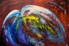 В картине преобладает глубокий, насыщенный красно-коричневый фон, напоминающий глину или раскалённую магму, что придаёт сцене мощную, почти вулканическую энергетику. На этом фоне разворачивается буйство цвета и фактуры.