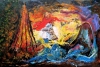 The lower part of the painting occupies a cool, dynamic blue zone reminiscent of turbulent waters or mountain glaciers. This contrast between «fire» above and «water» below creates dramatic tension.