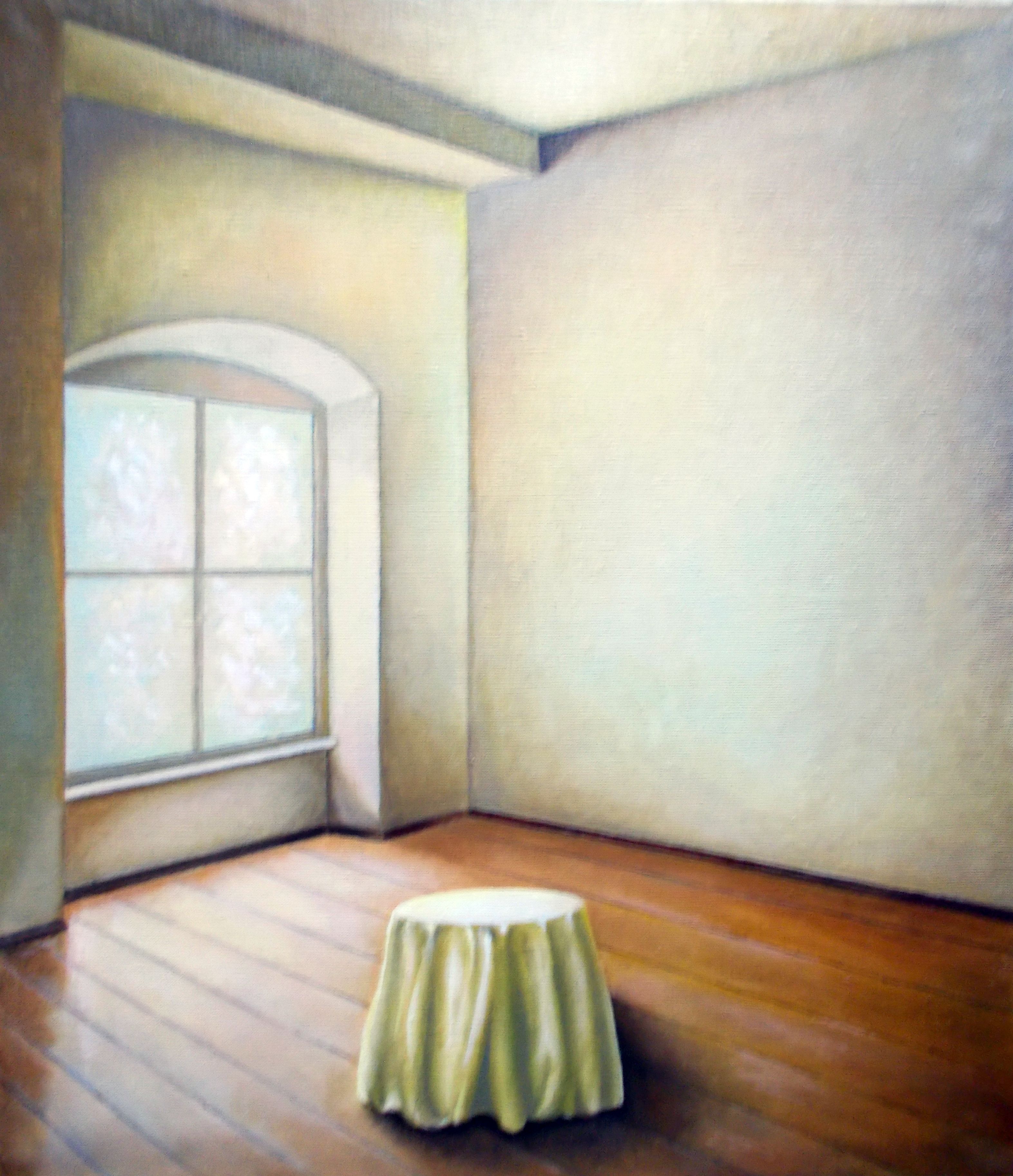 On the left dominates a tall arched window divided by a cross into four parts. Beyond the glass is an indistinct glowing haze hinting at an external life that remains outside this secluded space.