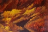 На полотне мы видим не конкретный пейзаж, а некое видение: плотные, «горящие» мазки золотистого, охристого и насыщенного красного цветов складываются в динамичный узор. Темные, почти черные участки прорезают эту цветовую массу, напоминая о лесных прогалинах, извилистых руслах рек или густых сумерках. Эта работа — не изображение осени, а её эмоциональный слепок.