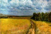 Абаимов виртуозно работает с цветом: золотисто-жёлтые переливы в поле контрастируют с глубокими тенями леса и синевой неба, создавая ощущение гармонии и спокойствия. В этой работе нет суеты — только вечное течение жизни, тишина августовских дней и та особая светлая грусть, которая всегда сопровождает уходящее лето. Пейзаж дышит умиротворением, становясь для зрителя островком стабильности и красоты.