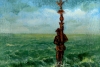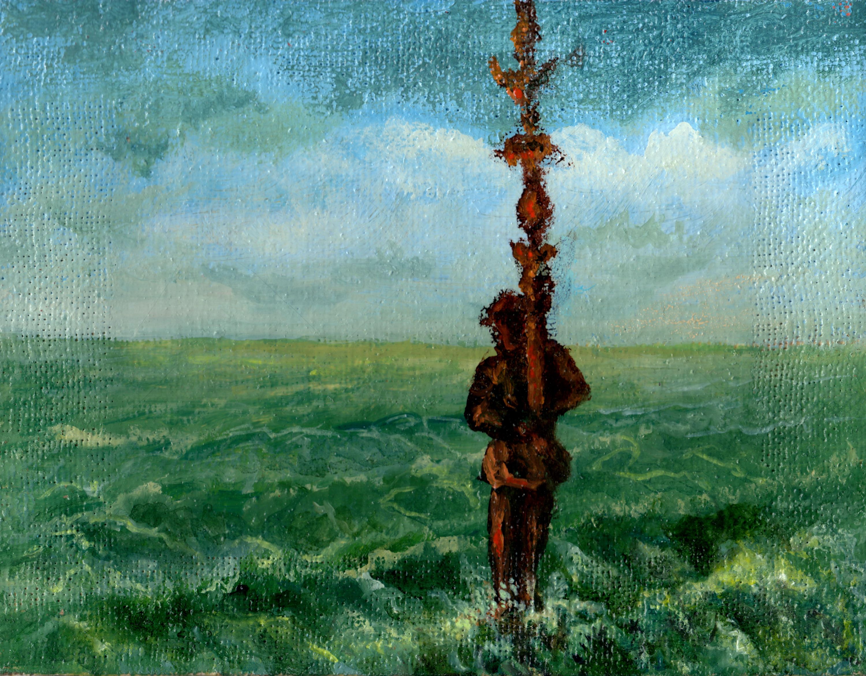 Vladimir Abaimov's painting «The Carrier» is a deeply symbolic and concise piece, reminiscent of a parable captured on canvas. At the center of the composition is a solitary figure whose silhouette almost merges with the background, holding a tall, intricate staff or ritual scepter. This vertical element, reaching towards the sky, contrasts with the wide, horizontal expanse of the green field, creating tension between the earthly and the celestial, between movement and stillness.