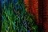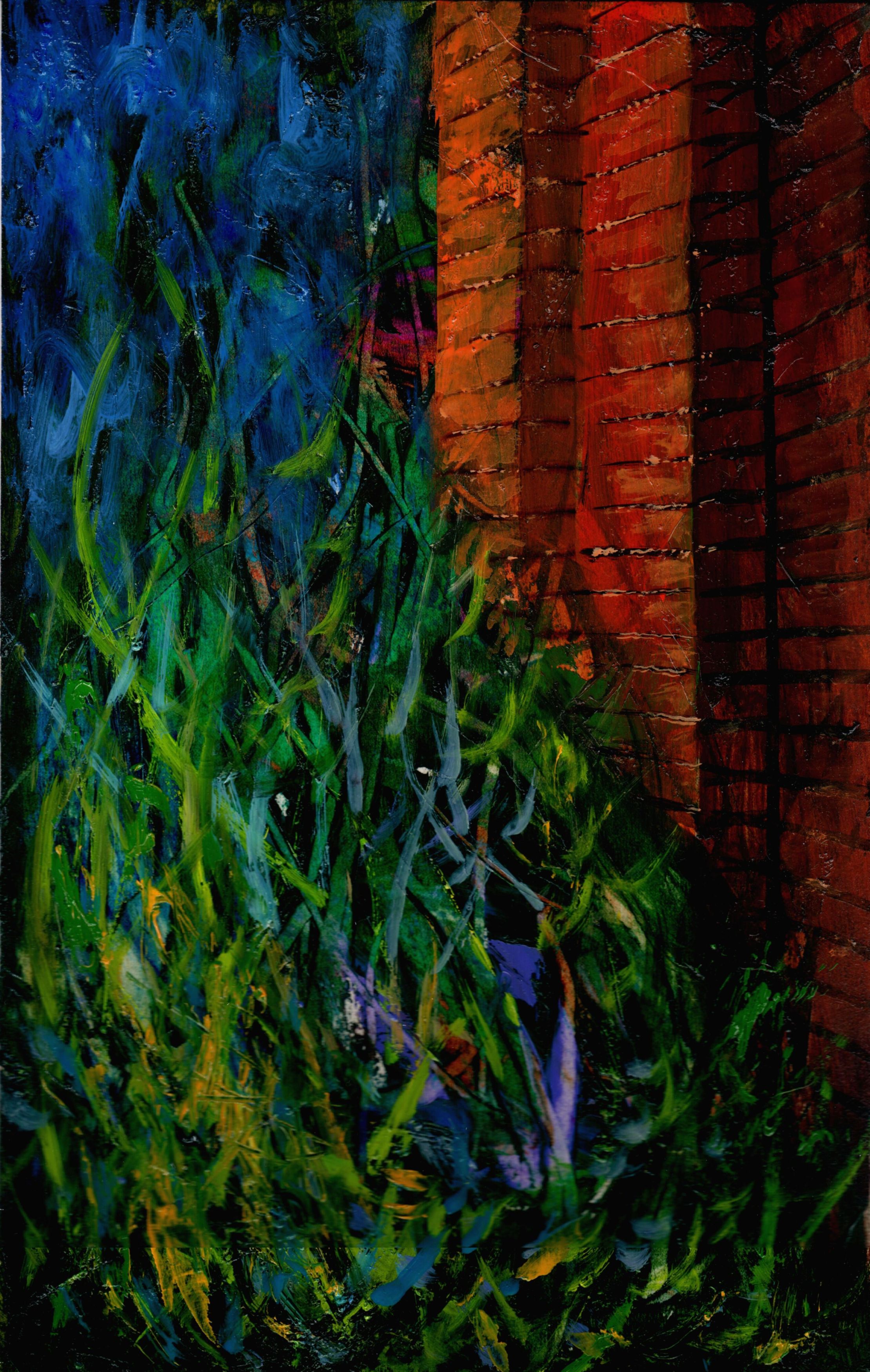 Картина Владимира Абаимова «Последняя остановка» — лаконичная, но глубоко символичная работа, в которой противопоставление живой природы и неживой материи создает мощное эмоциональное напряжение. Композиция разделена на две части: слева мы видим хаотичную, почти агрессивную динамику зелёных трав, словно сцепившихся в борьбе, а справа — неподвижную, строгую кладку кирпичной стены.