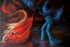 Отсутствие верхней части фигуры придаёт образу глубину и загадочность, заставляя зрителя гадать, кто же является свидетелем этого огненного действия. Контраст между жарким, агрессивным красным цветом огня и холодным синим сиянием, окутывающим ноги, создаёт напряжение, характерное для ночного кошмара или осознанного сновидения. Абаимов играет с пространством и смыслом, превращая обычный сюжет в метафору внезапности событий, меняющих реальность. Это работа о моменте, когда привычный мир сталкивается с необъяснимым, оставляя нас наедине с тьмой, светом и пульсирующим ритмом самой жизни.