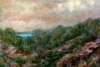 The canvas reveals features of the landscape: muted earthy and green tones form hills and a forest thicket, above which stretches a wide, light sky with pinkish clouds. An unexpectedly bright, almost electric blue accent in the center of the composition resembles a water surface or a clearing that draws the eye.