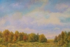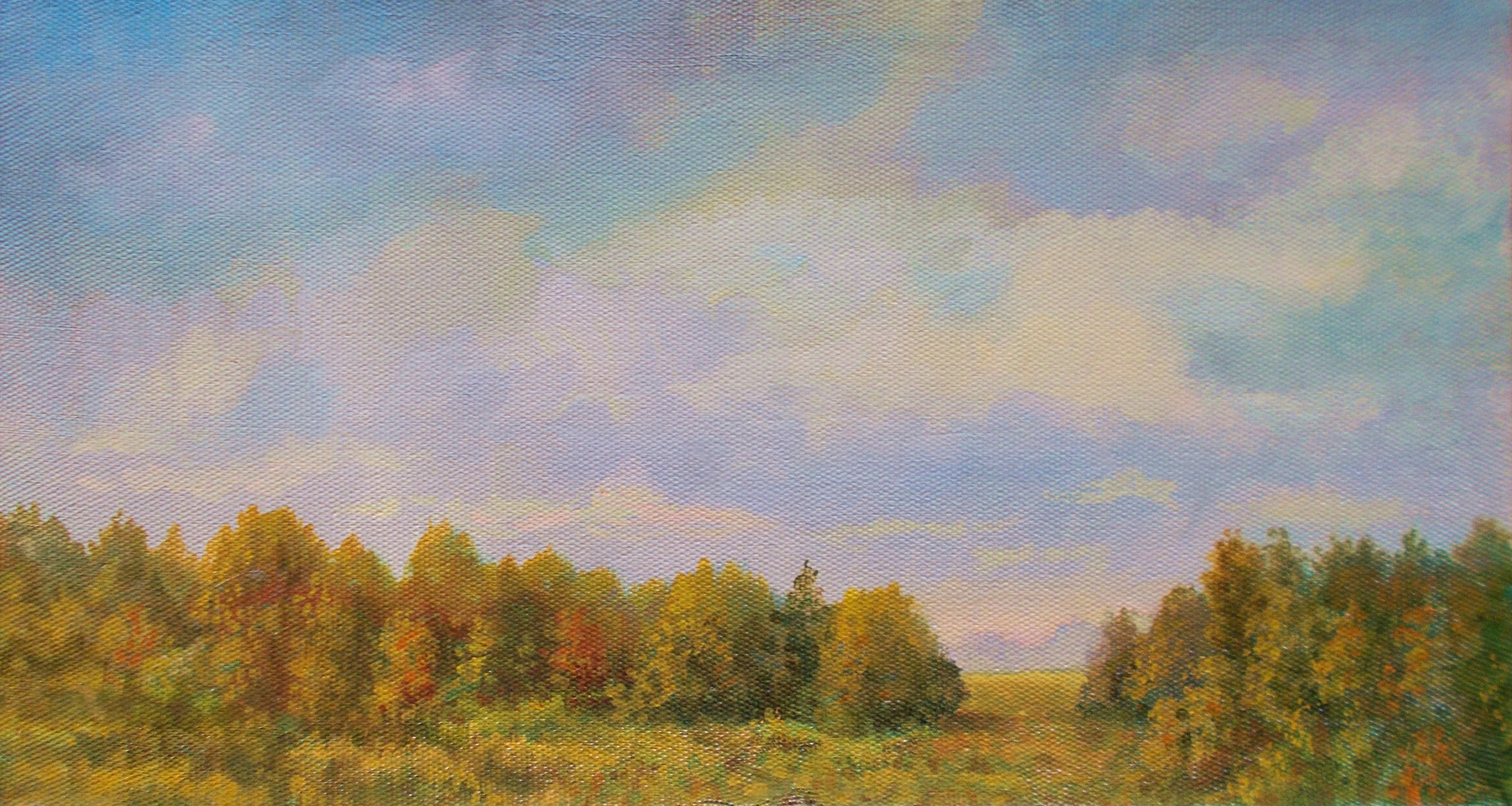 The canvas is dominated by a tall, expansive sky. The clouds, painted in pastel tones — creamy, light lilac, and gentle blue — create a sense of airiness and a light haze characteristic of early autumn. The horizon is framed by a strip of trees, where golden and yellow shades prevail, with touches of red hinting at the peak of autumn splendor. The ground below still holds remnants of summer greenery mixed with the first yellowing grasses.