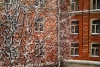 На картине изображён зимний городской пейзаж, где густо покрытые снегом ветви деревьев создают сложный ажурный узор на переднем плане. Насыщенный красно-коричневый фасад старинного кирпичного здания с множеством окон и вертикальной пожарной лестницей справа служит тёплым фоном. Белый снежный покров укрывает землю и тонкие ветви, придавая сцене графичность и спокойствие. Работа, выполненная маслом на холсте, передаёт фактуру и глубину зимнего дня.
