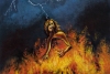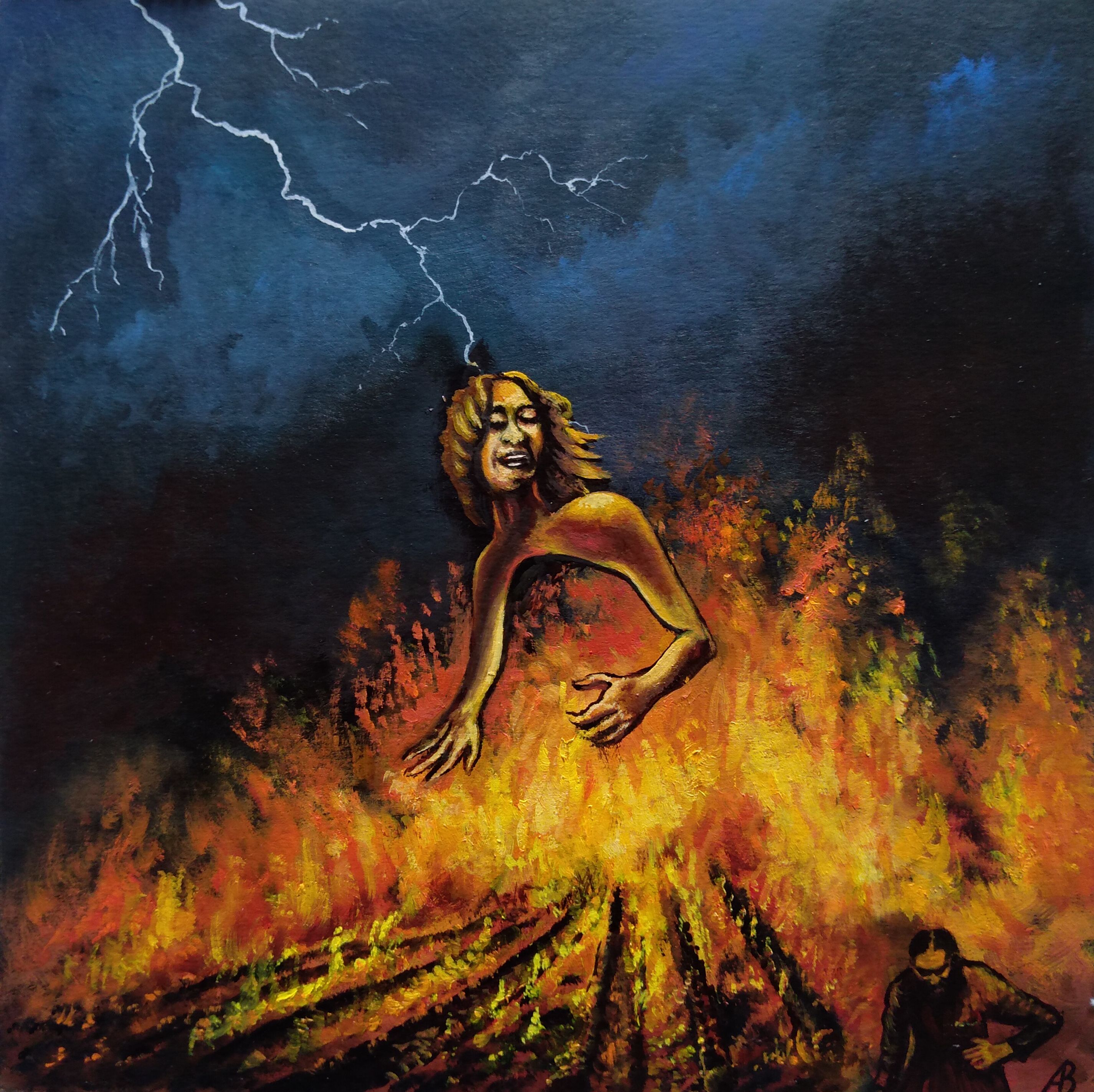 На картине разворачивается мощная и драматичная сцена сожжения ведьм. Из бушующего огня, написанного яркими мазками оранжевых, жёлтых и красных оттенков, возникает фигура женщины с развевающимися волосами и открытым ртом, выражающим глубокие эмоции. Над пламенем простирается грозовое небо, пронзённое ослепительной молнией, что усиливает напряжение композиции. В правом нижнем углу едва различима тёмная фигура, погружённая в свои думы. Произведение захватывает динамичной палитрой и экспрессивной манерой письма, передающей первобытную мощь.