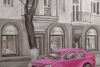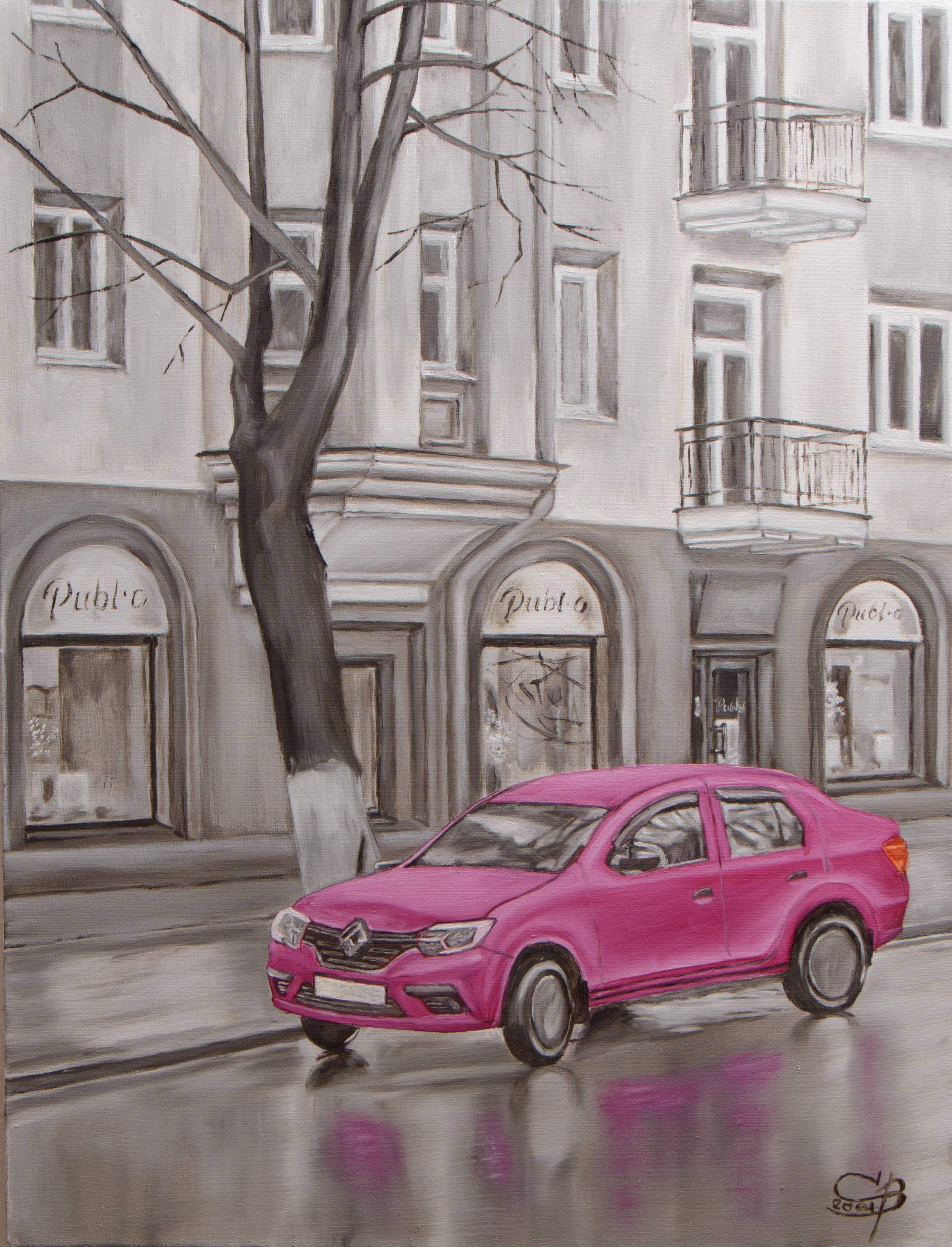В дождливый день я гулял по городу. Среди серых оттенков пейзажа стоял розовый автомобиль. У меня возникла идея написать картину в монохроме, выделив ярким пятном машину.