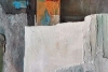 The palette of the painting is complex and multilayered. In the lower part, muted shades of white, gray, and pale blue dominate, creating the impression of old, weathered walls or architectural fragments. These light tones stand out due to their volume.