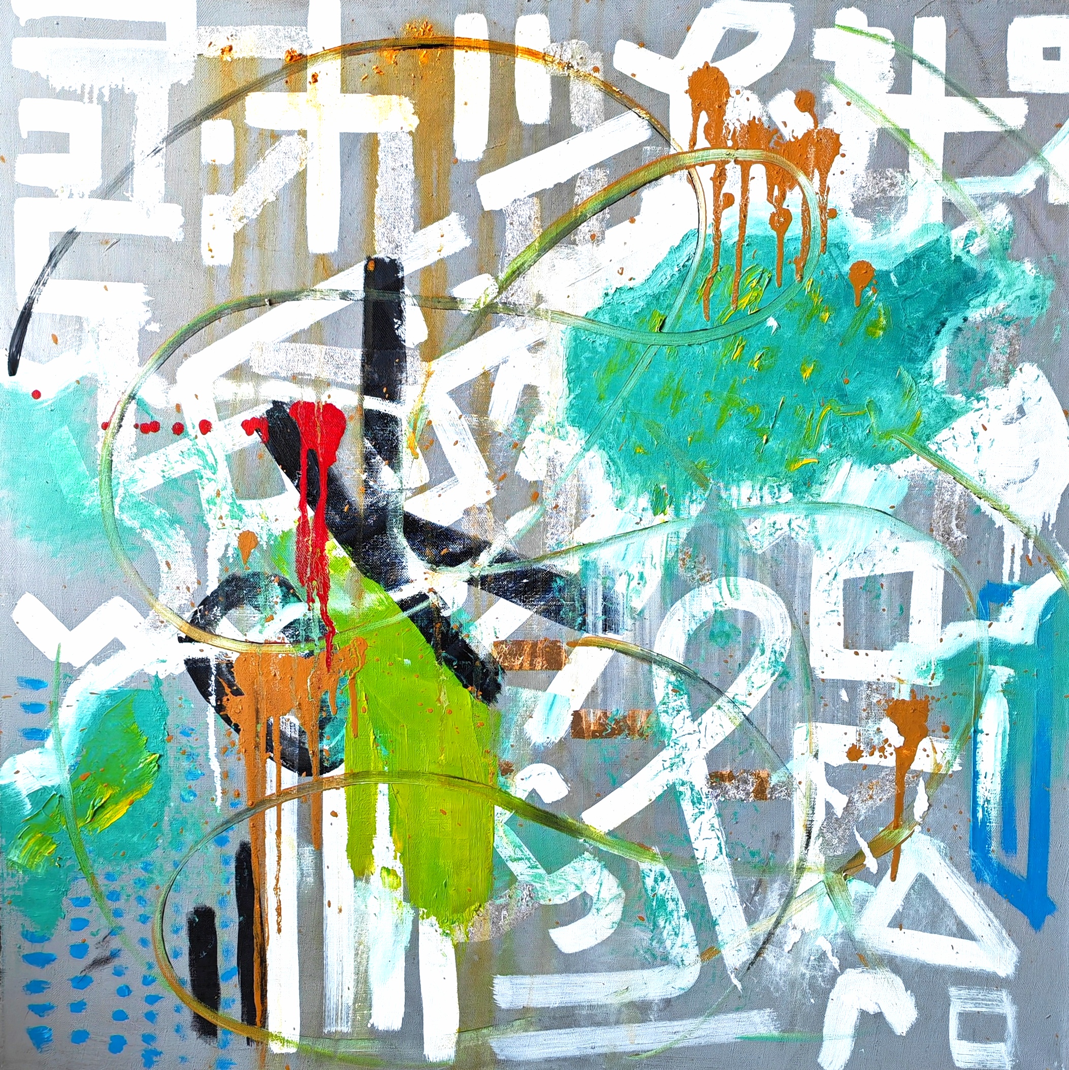 With elements of symbols, fonts, and runes. Painted with acrylic on canvas.