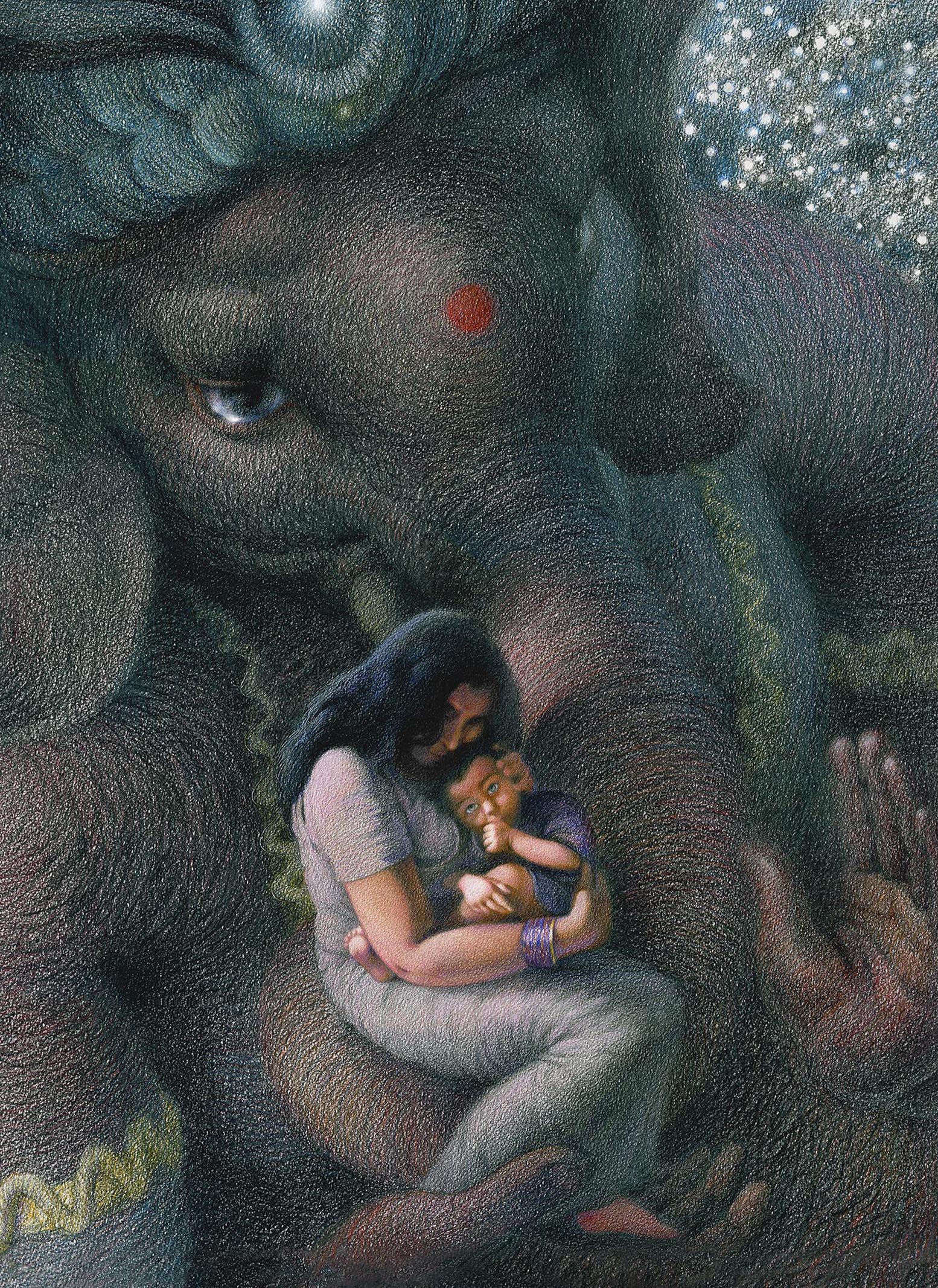 В своей работе "MYSTERY" я сделал робкую попытку отразить это фундаментальное сходство, изобразив Матерь с Ребёнком на руках, воплощённого в человеческой форме, которого бережно держит на руках божественный ребёнок Ганеша — универсальный, нерождённый, не проявленный в видимом мире.
