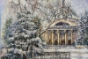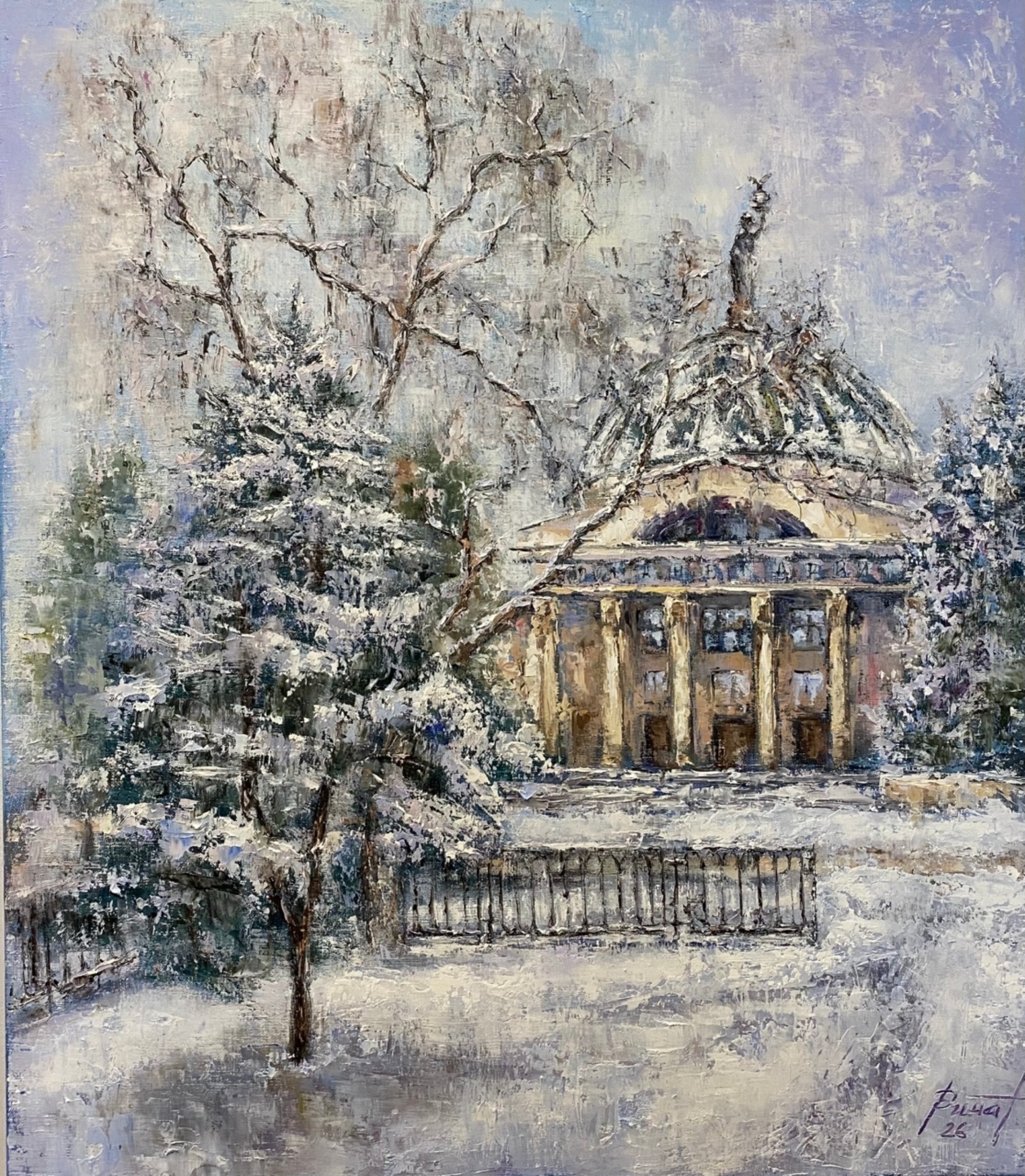 Картина Рината Хабибулина «Зимний Волгоград. Планетарий» — тонкая, лиричная зарисовка, в которой архитектурное величие сочетается с нежной красотой русской зимы. Художник мастерски передаёт застывший город под тяжёлыми снежными шапками, превращая знакомый каждому волгоградцу фасад Планетария в сказочный храм знаний.