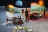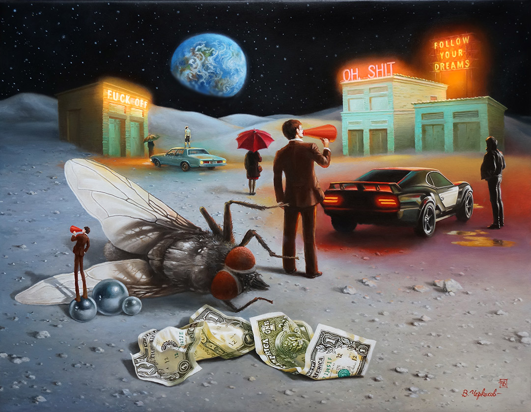 ”Сон в лунную ночь (почти по Шекспиру) или два помятых бакса” - это ещё одна работа из лунной темы. Цветовая палитра картины не мрачная, наоборот, там много света, люди, в общем жизнь на Луне присутствует, но сразу чувствуется, что тут что-то не так. Каждый в сюжете конечно увидит своё. Например два мятых доллара могут символизировать материальные ценности и их быстротечность, в то время как спящая муха может быть метафорой того, как наши маленькие действия могут иметь большие последствия. На зданиях видны загадочные надписи, которые, возможно, являются посланиями из прошлого или будущего. Они совершенно противоречивые по смыслу и это добавляет интриги и в изображение. Ну и основной персонаж с рупором мной был взят из других работ специально. Это как герой сериала, переходящий из серии в серию.