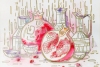 Эта работа продолжает традиции классического натюрморта, привнося современную свежесть и легкость через использование акварели и акриловых маркеров. Гранаты, символизирующие плодородие, изобилие и жизненную силу, представлены яркими цветами и текстурой, подчеркивая их природную красоту и глубину.