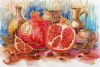 Эта работа представляет собой современную интерпретацию классического натюрморта, где гранаты служат символом изобилия, плодородия и жизненной силы. Использование акварели и акриловых маркеров придаёт композиции лёгкость и прозрачность, создавая яркую игру света и цвета.
