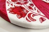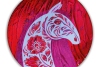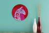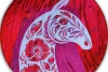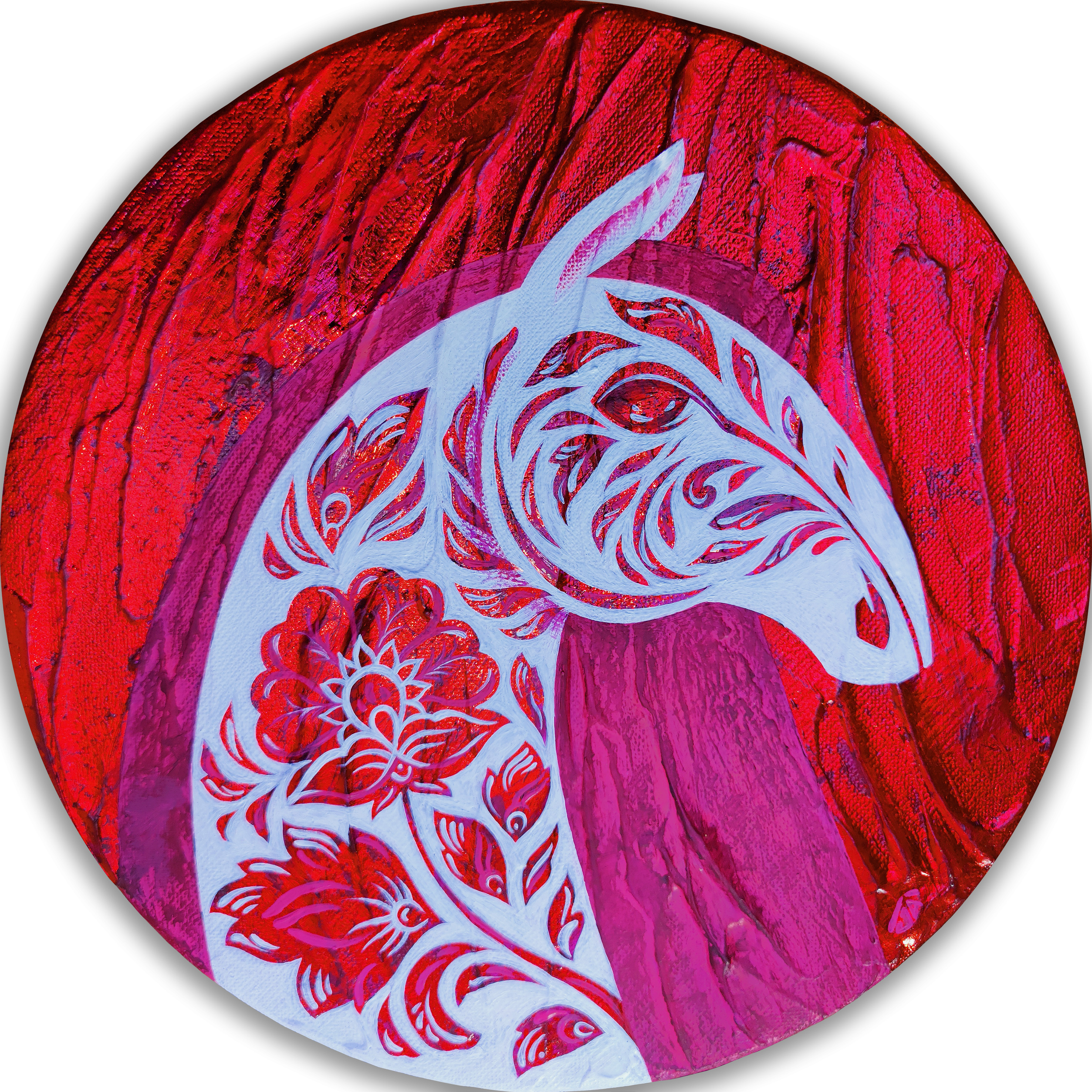 Эта работа — гармоничное сочетание силы и изящества, воплощённое в образе белой лошади, украшенной красным цветочным орнаментом, напоминающим традиционную роспись. Сочетание акрила и красной фольги на круглом холсте создаёт глубину и мерцающий эффект, подчёркивая благородство и мистическую красоту животного.