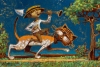 На спине кота сидит маленький стилизованный наездник. Он одет в простую рубашку и штаны, на голове у него широкополая соломенная шляпа с пером. Главный акцент — труба, которую наездник подносит ко рту и дует в неё, издавая «призыв». Его поза говорит о решительности и весёлом настроении.