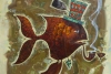 На голове у рыбы красуется высокий, богато украшенный цилиндр или шляпа с пером в бирюзовых и красных тонах. Этот головной убор — явный признак её «важности». Из пасти рыбы торчит трубка, из которой поднимается тонкая струйка дыма, что придаёт ей вид задумчивого курильщика. На шее у рыбы висит ожерелье с бирюзовым кулоном, дополняющее её аристократический образ.