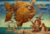The artist's style, with its clear contours and warm color palette, lends credibility to this fantasy. The painting is a witty reflection on the fact that true art can enchant even the most unexpected worlds.