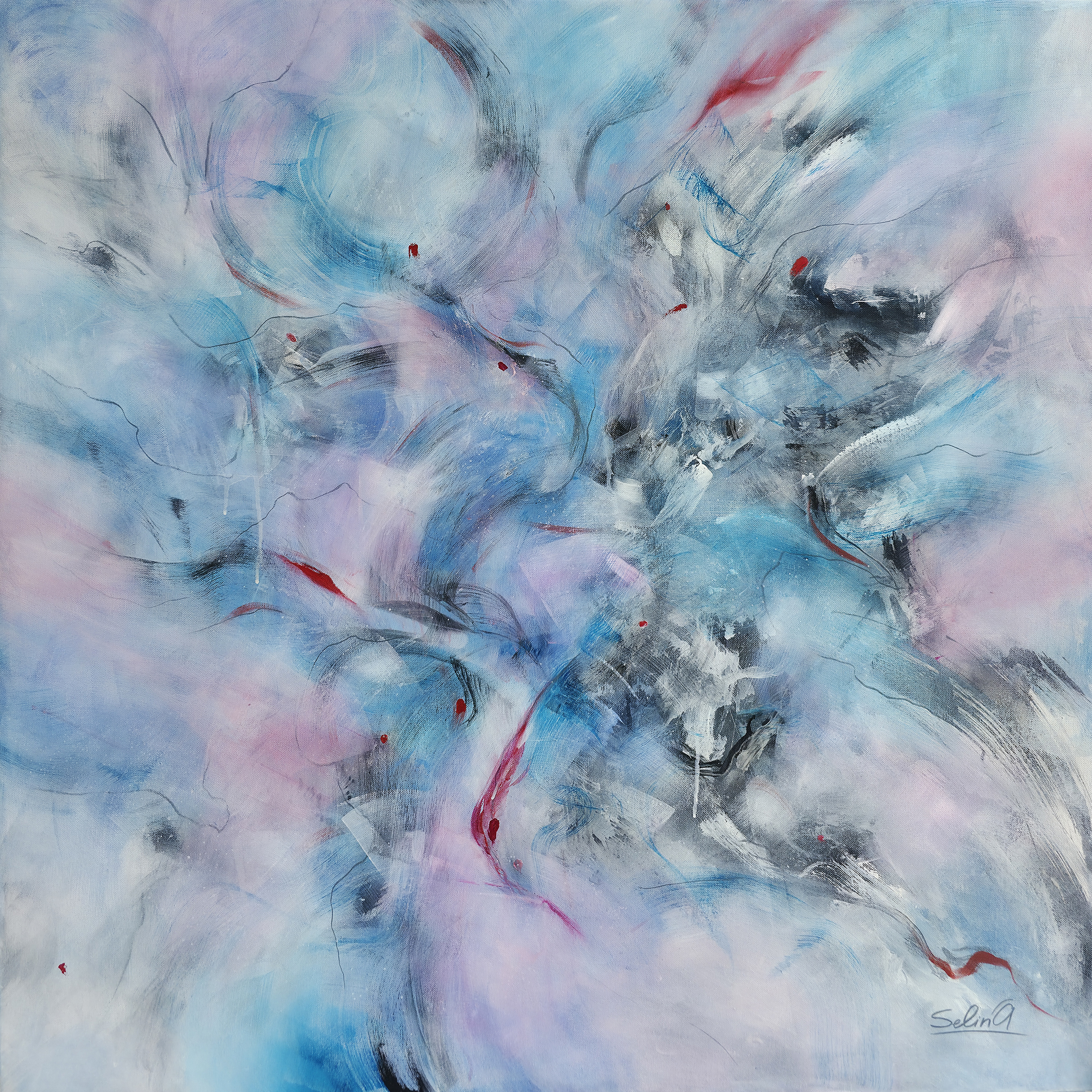 This captivating abstract artwork bursts with energy and emotion, commanding attention with its dynamic interplay of colors and textures. Swirls of cool blues and soft pinks create a tranquil yet invigorating backdrop, while bold strokes of white add depth and movement. Sporadic streaks of red punctuate the canvas, injecting vibrancy and tension into the composition. Each brushstroke is purposeful, contributing to an impression of fluidity and chaos that challenges the observer's perception. The ethereal quality evokes a sense of calm despite its apparent tumult, making it a fascinating study in contrasts. This piece stands out for its ability to conjure multiple interpretations, inviting viewers to explore its depths repeatedly. The artwork’s seamless blend of hues and textures uniquely captures the essence of abstract expressionism, leaving a powerful, lasting impact.