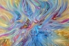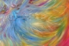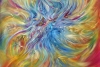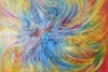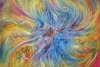 This vibrant artwork is an explosion of color and energy, captivating viewers with its swirling patterns and dynamic movement. The center of the piece is dominated by a flash of electric blue, surrounded by twisted ribbons of fiery orange, deep violet, and radiant yellow. These bright shades blend smoothly, creating a sense of fluidity and continuous motion. The composition, reminiscent of a cosmic explosion, evokes both chaos and harmony simultaneously.